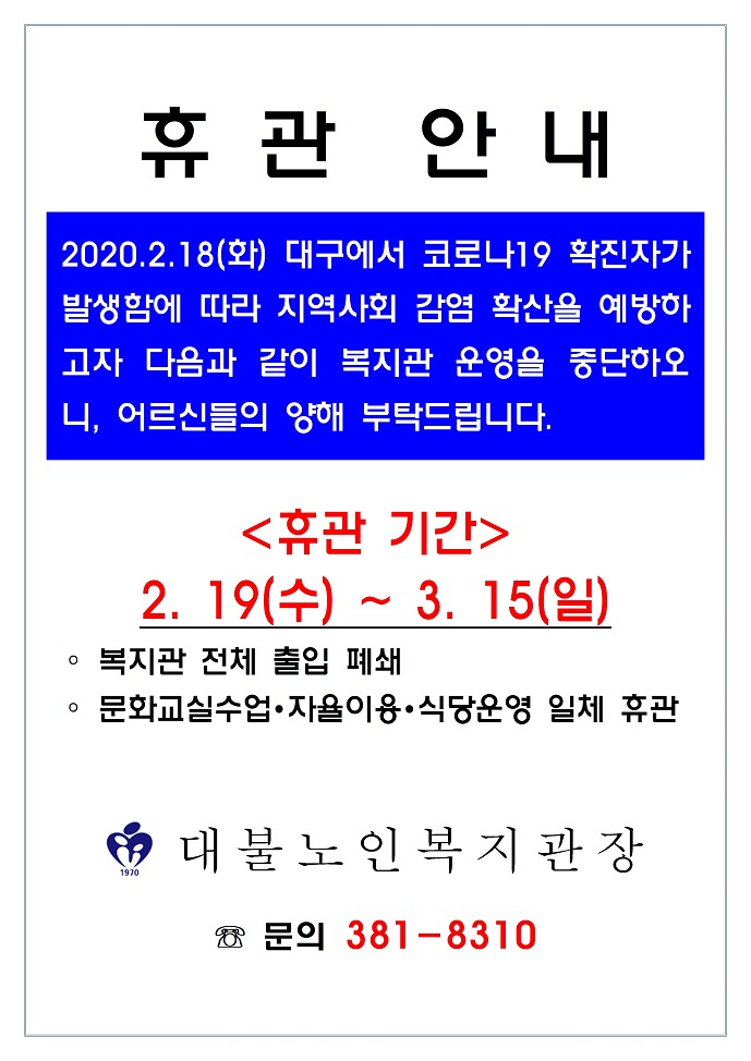 '코로나바이러스감염증-19'로 인한 휴관 안내